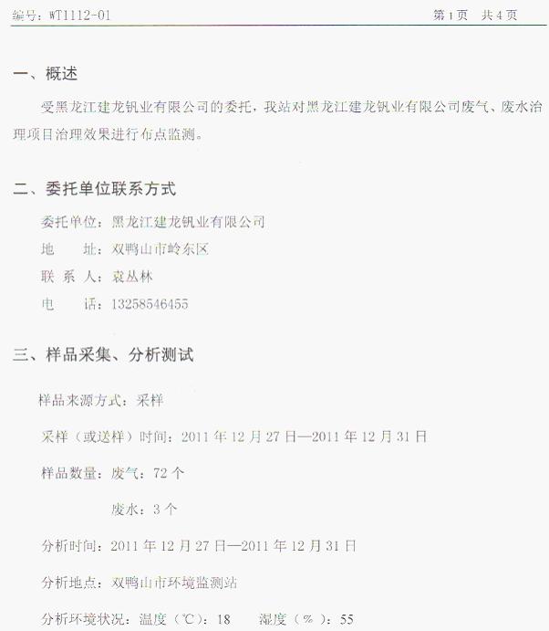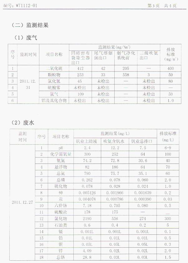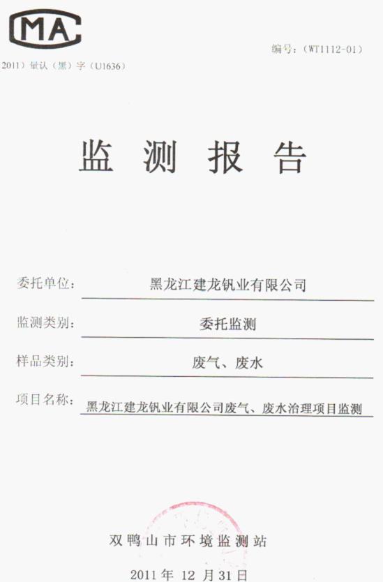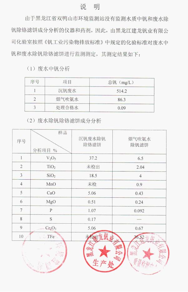 黑龍江建龍釩業(yè)有限公司5000噸V2O5廠的沉釩廢水釩鉻治理——煙氣吹氨達(dá)標(biāo)工程于201112月竣工正式投產(chǎn),并于201112月順利通過(guò)業(yè)主方組織的按GB26452-2011 釩工業(yè)污染物排放標(biāo)準(zhǔn)規(guī)定的項(xiàng)目環(huán)保達(dá)標(biāo)監(jiān)測(cè),工程已完成工程驗(yàn)收。