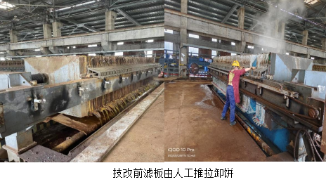 2022年3月威遠(yuǎn)藍(lán)鼎正式接手成渝釩鈦科技欣興釩廠新區(qū)水處理整套水處理系統(tǒng)。運行至今,反應(yīng)釜壓濾機(jī)平臺在用的6臺壓濾機(jī)自動卸餅功能全部損壞,每臺壓濾機(jī)87塊濾板,平均每臺卸餅在1.5小時,每班人工依次卸餅一次,最高頻次兩次,人工勞動強(qiáng)度大,工作效率低。高產(chǎn)期間無法滿足濾水要求,同時因為環(huán)境和勞動強(qiáng)度致使員工離職率高。