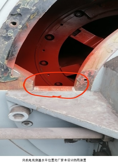 1月27日13時,一號燒結(jié)機槽滿停機,對應(yīng)的一期脫硫脫硝系統(tǒng)正常停機檢修。檢修班按照檢修計劃重點對增壓風(fēng)機電機開側(cè)蓋檢查,電儀人員首先對增壓風(fēng)機電機執(zhí)行停電、驗電、接地、換牌、掛牌等安全措施。在檢查過程中發(fā)現(xiàn)電機側(cè)蓋水平位置處電機廠家未設(shè)計防進(jìn)水裝置,雖然電機制作了雨棚,但是如遇風(fēng)雨交加極端情況時電機側(cè)面可能存在飄雨,雨水有可能會進(jìn)入到電機內(nèi)部的風(fēng)險。