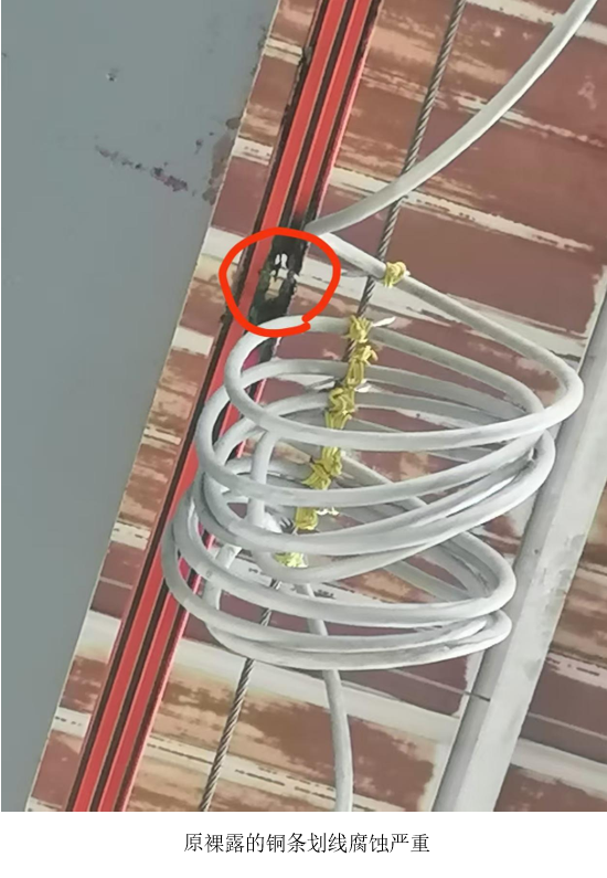 該車間原行車電源采用傳統(tǒng)裸露式銅條滑線,因工作環(huán)境中有腐蝕性氣體和濕氣,銅滑線被嚴(yán)重腐蝕甚至斷裂,行車電源故障頻發(fā),嚴(yán)重影響物料轉(zhuǎn)運與生產(chǎn)工序,維護工作也耗費大量人力物力。